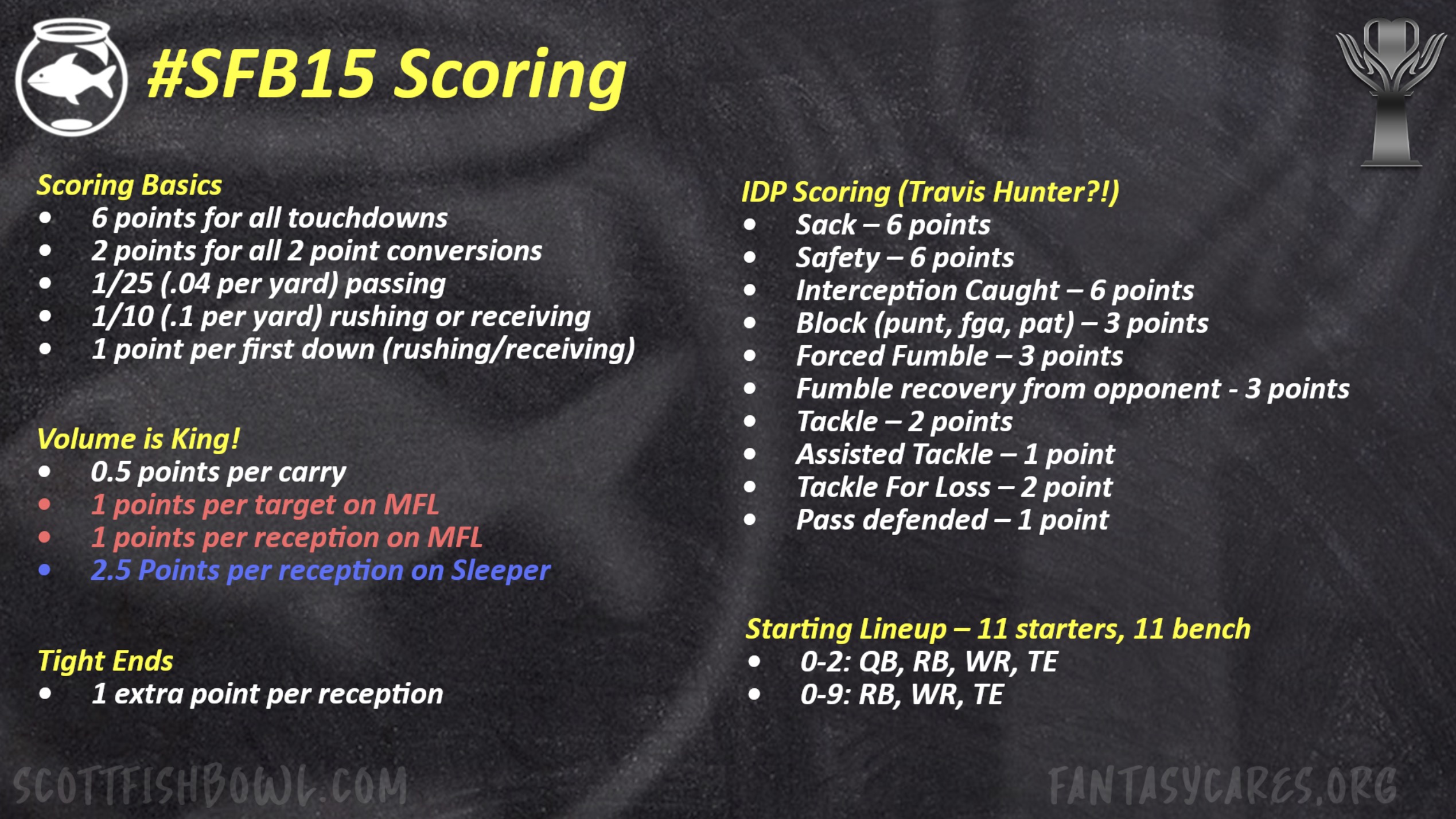 What makes the Scott Fish Bowl so unique is that the scoring settings change radically from year to year. He always has a new wrinkle to the system to make the scoring far different from regular redraft leagues. The wildly different scoring settings make every draft unique, as managers can employ a variety of drafting strategies, and any of them can be effective.